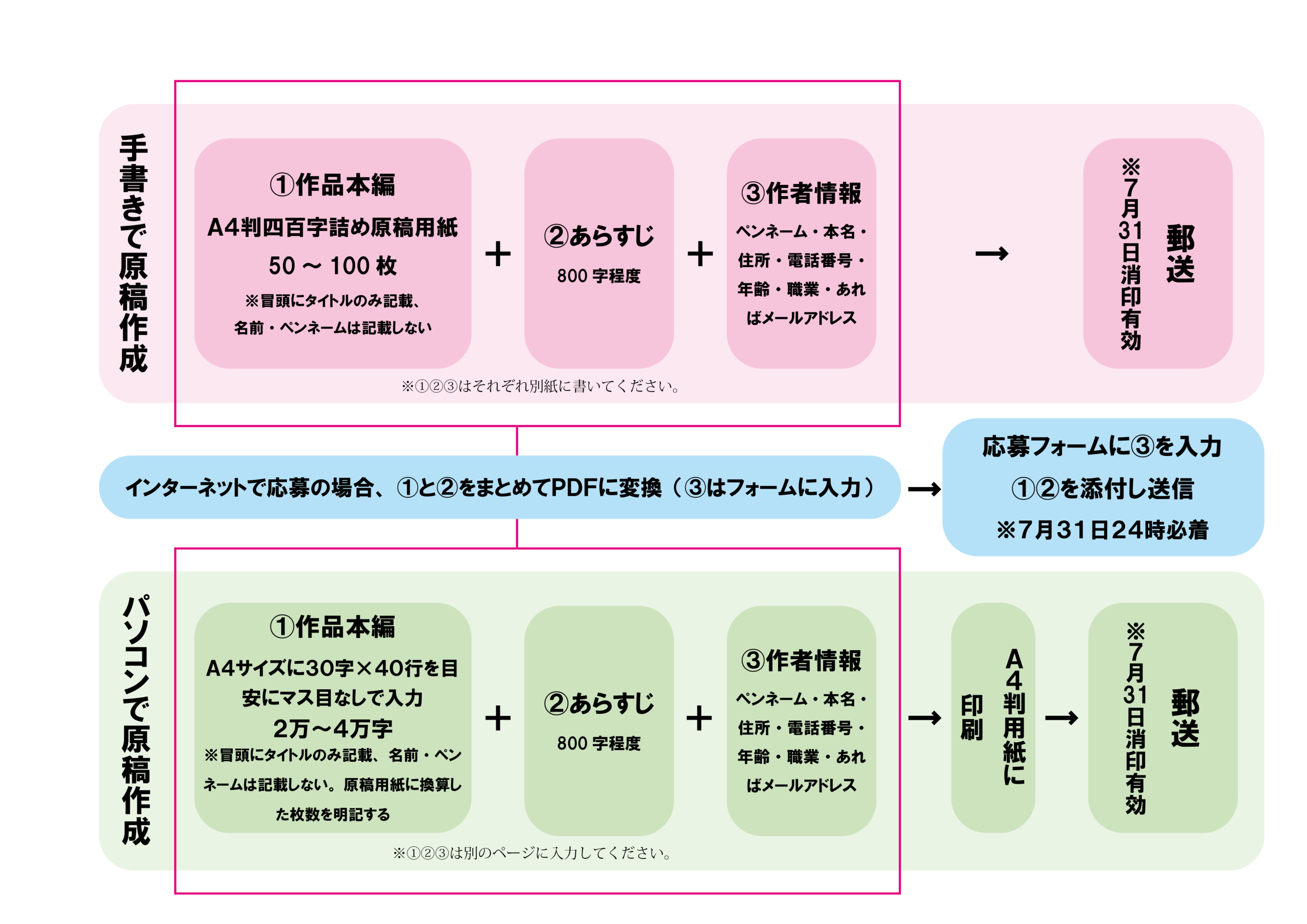 ③作者情報(本編とは別紙、別ページに記入。ペンネーム・本名・住所・電話番号・年齢・職業・あればメールアドレス)